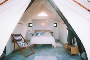These are regular camping tents with soace inside. A real bed, bedside table, fan and electrical outlet. Pretty awesome for camping on the beach. And the communal areas are very close by so there’s plenty of space to hang out by the pool in the outdoor dining room in the yoga room or on the beach. Only 8 available